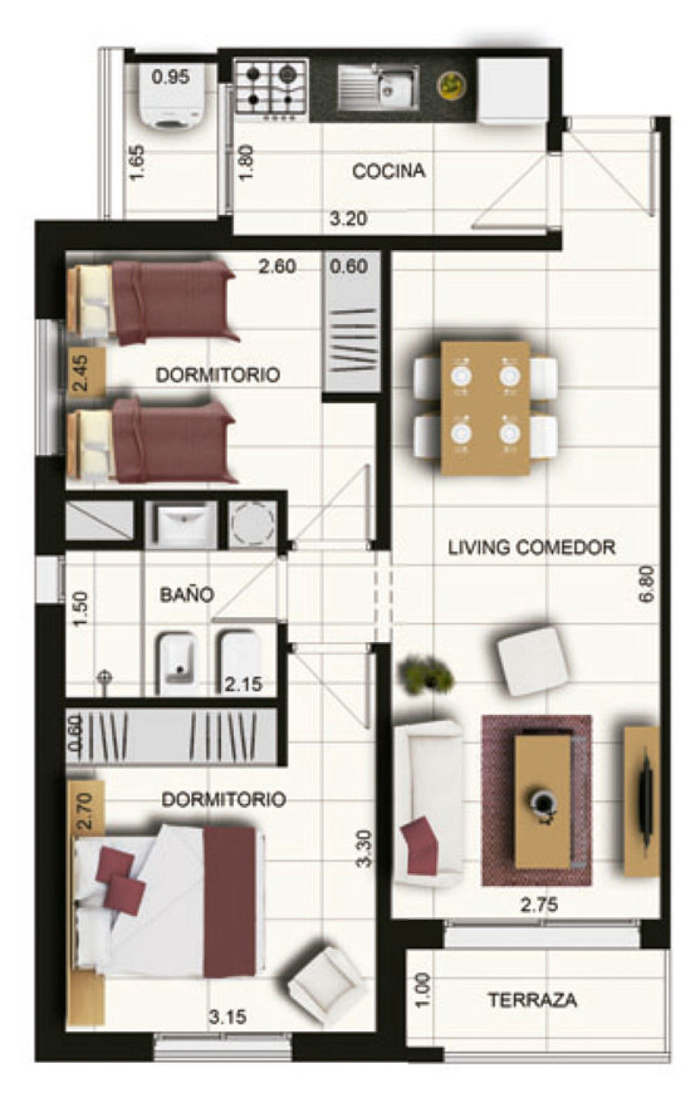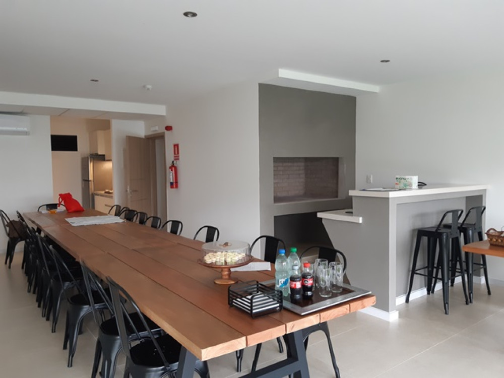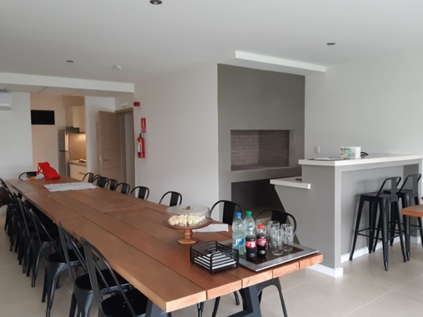 52m2 edificados, living-comedor con terraza, cocina definida con muebles y terraza de servicio, 2 dormitorios con placares y baño. Además tiene cochera. El edificio cuenta con tótem de seguridad, barbacoa común en planta baja, cerca perimetral y rejas. Precioso entorno verde.