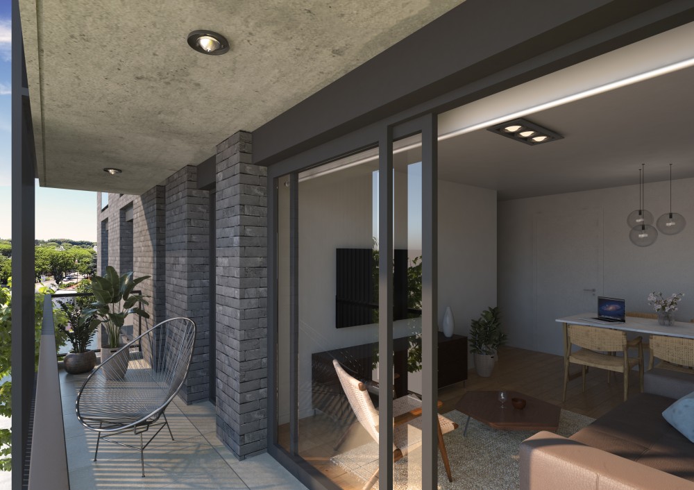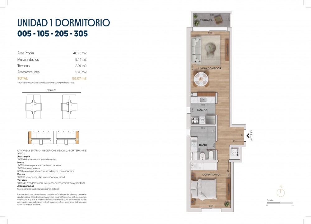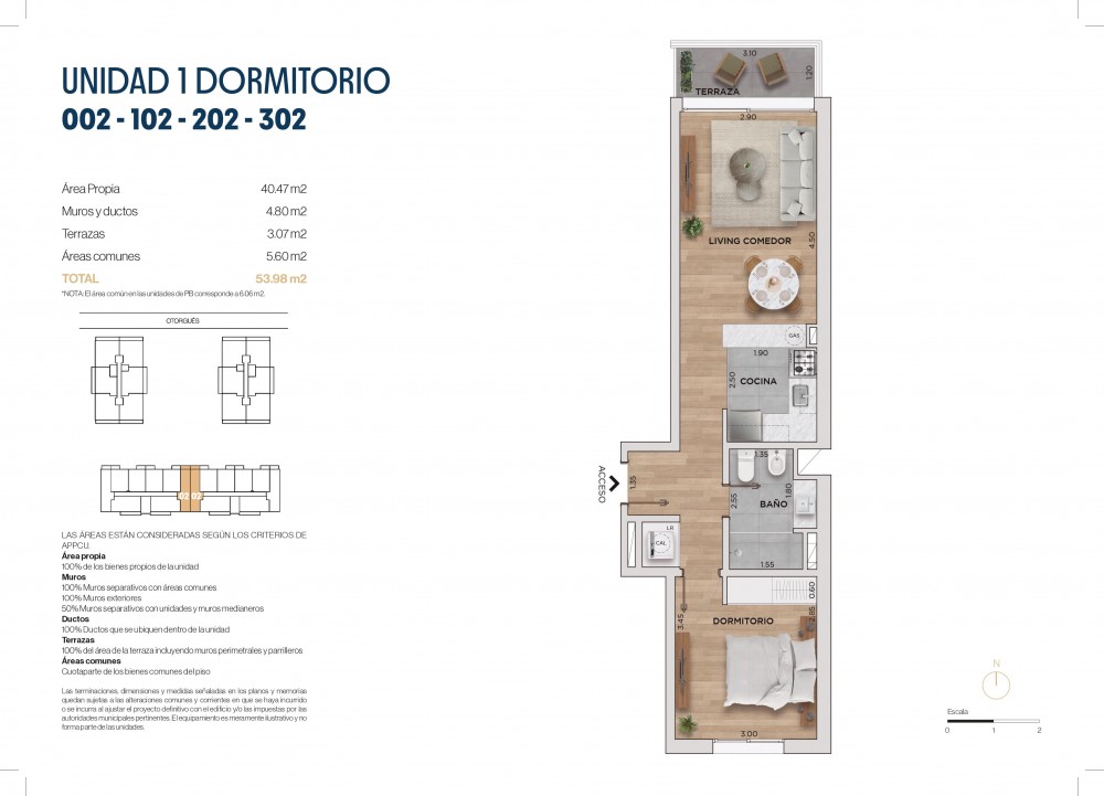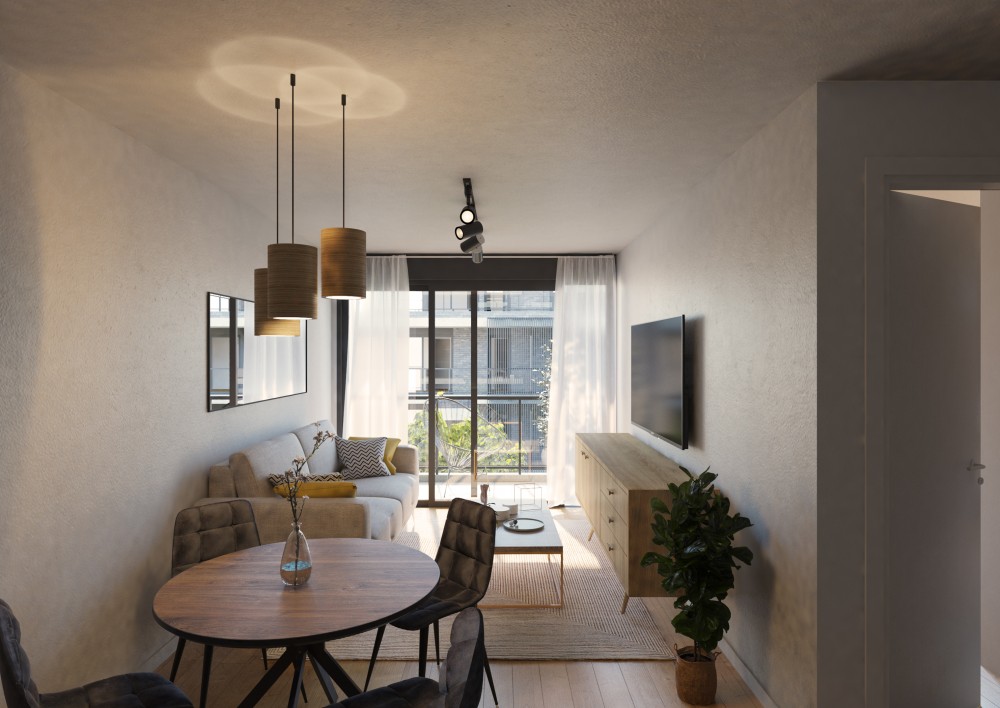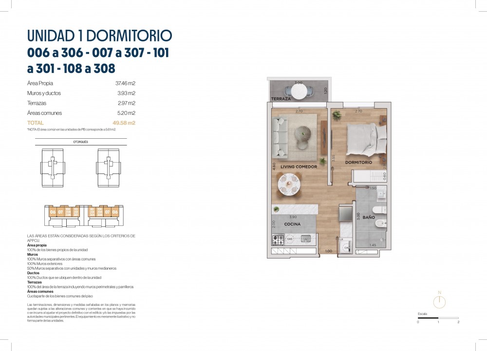 El Proyecto se desarrolla en 4 bloques con 106 apartamentos de tipo: monoambientes, 1 y 2 dormitorios distribuidos en planta baja y tres niveles, todos ellos con terraza.