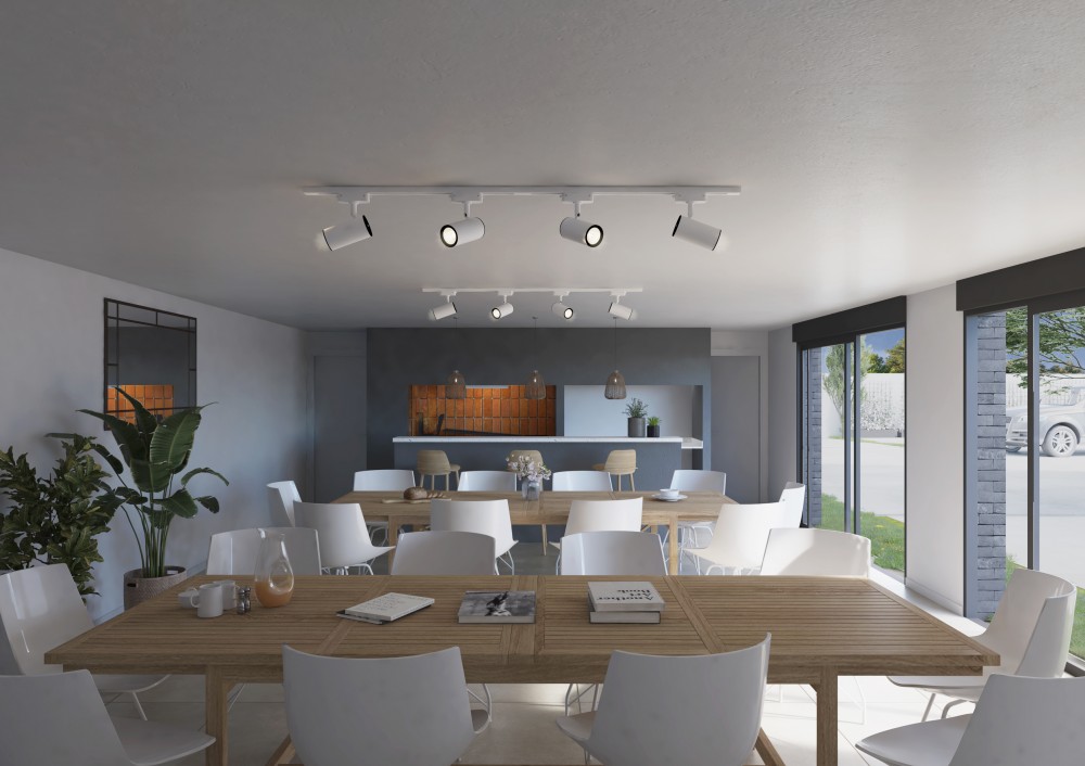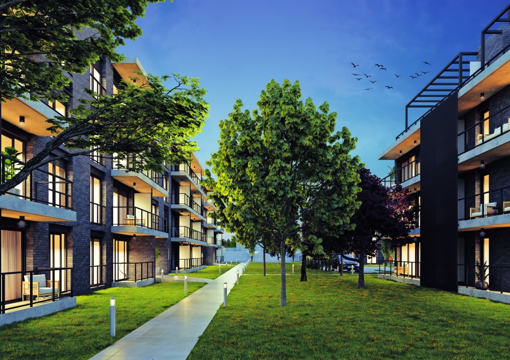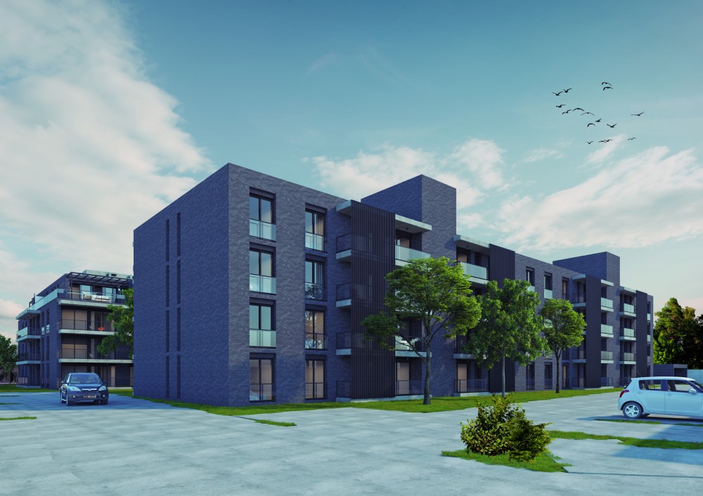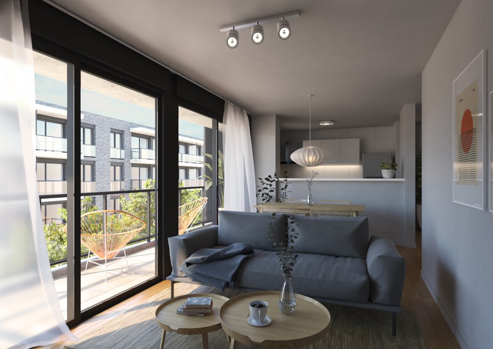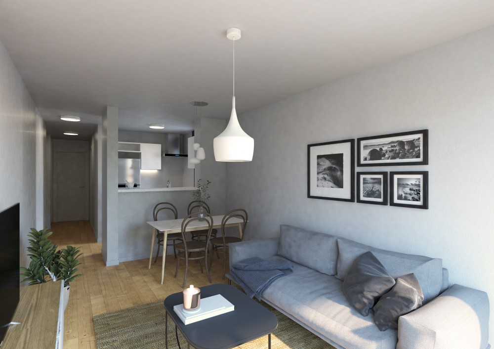 El Proyecto se desarrolla en 4 bloques con 106 apartamentos de tipo: monoambientes, 1 y 2 dormitorios distribuidos en planta baja y tres niveles, todos ellos con terraza.