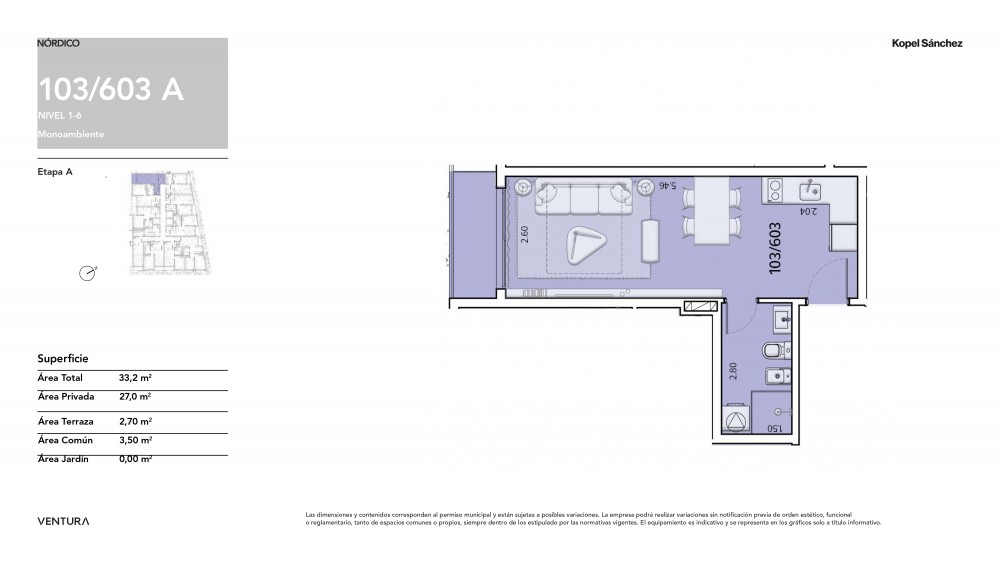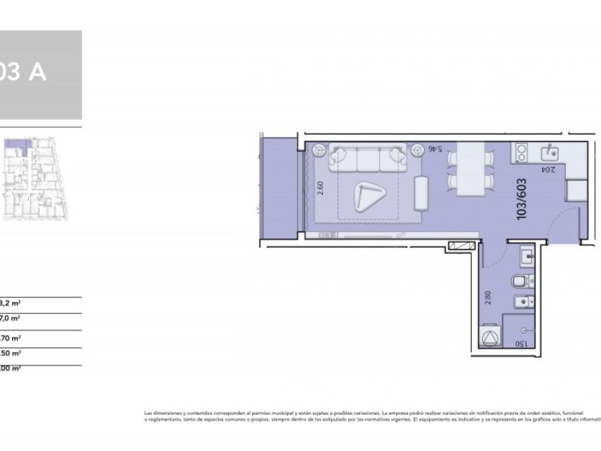 Monoambiente de 27m2 edificados. Living-comedor, cocina integrada con placares aéreos y bajo mesadas, y baño. Cuenta con balcon.
