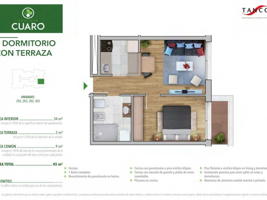 Apartamento al contrafrente de 1 dormitorio, 34m2 que tienen: living-comedor con terraza, cocina con placard y baño completo. Muy buena iluminacion.