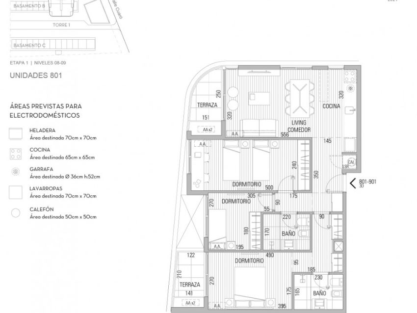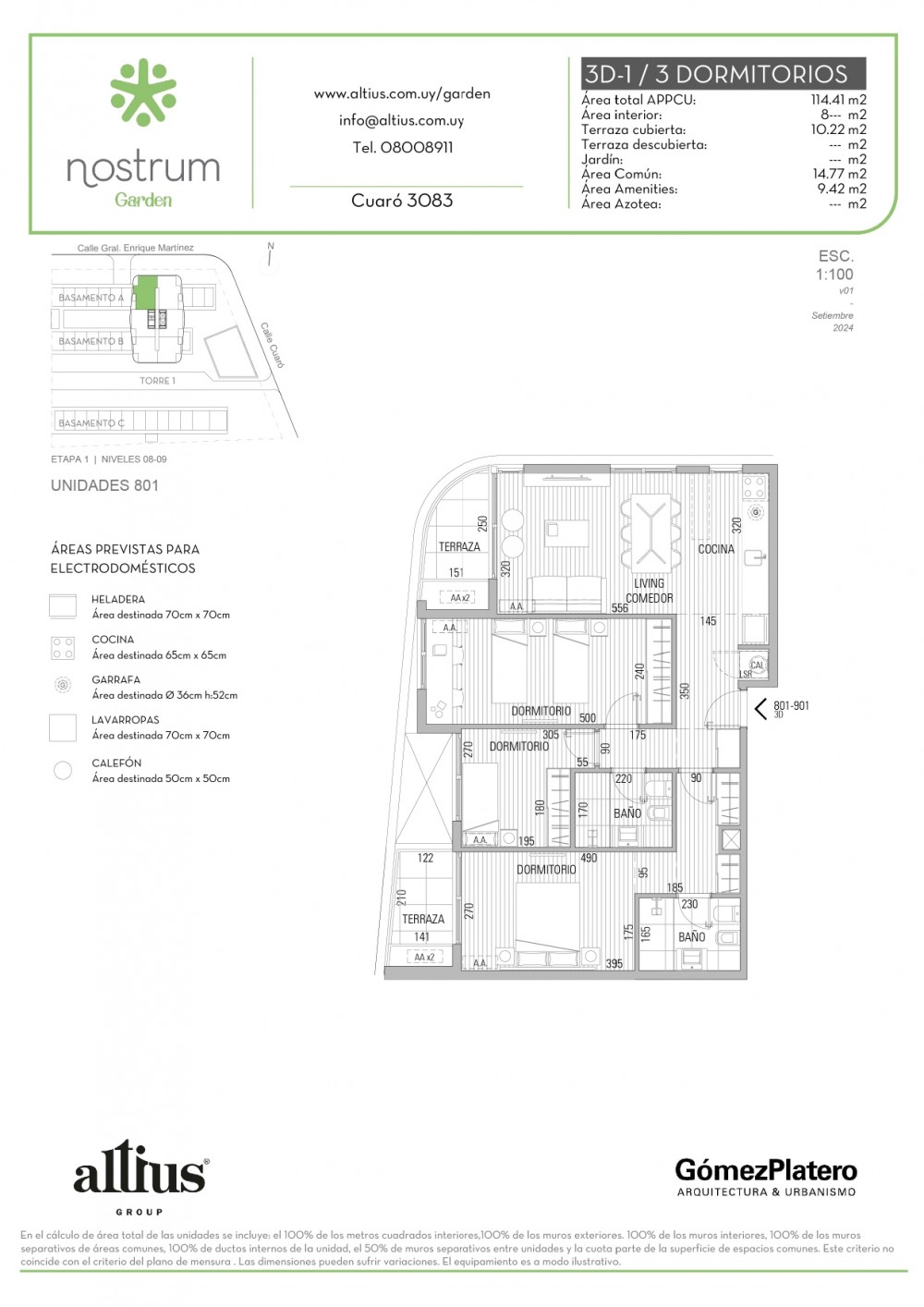 Apartamento de 3 dormitorios. Living-comedor con salida a terraza, cocina, 2 baños y uno de los dormitorios cuenta con salida a terraza. 114m2.