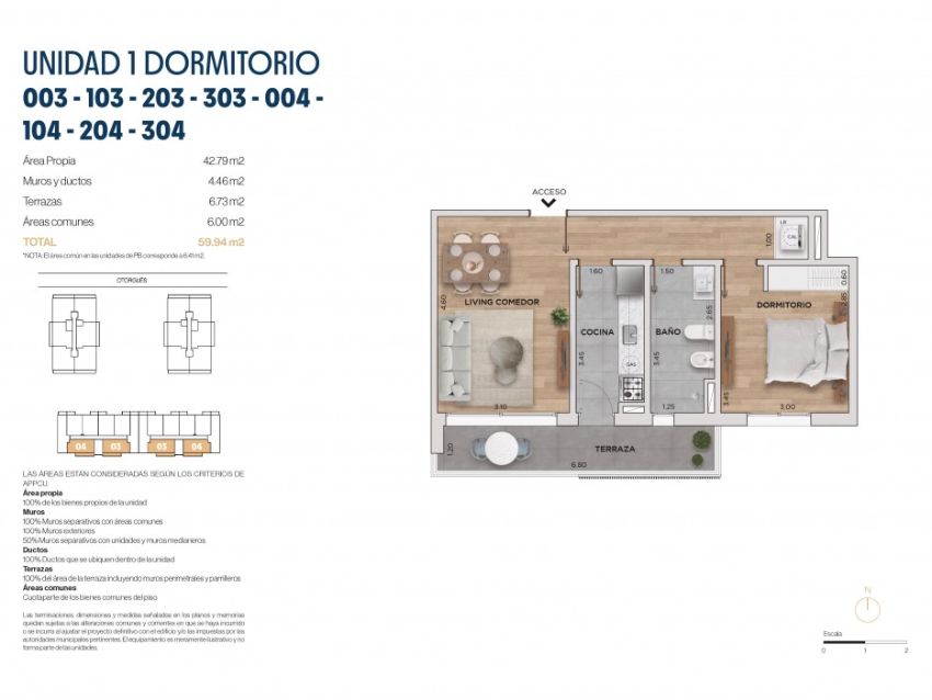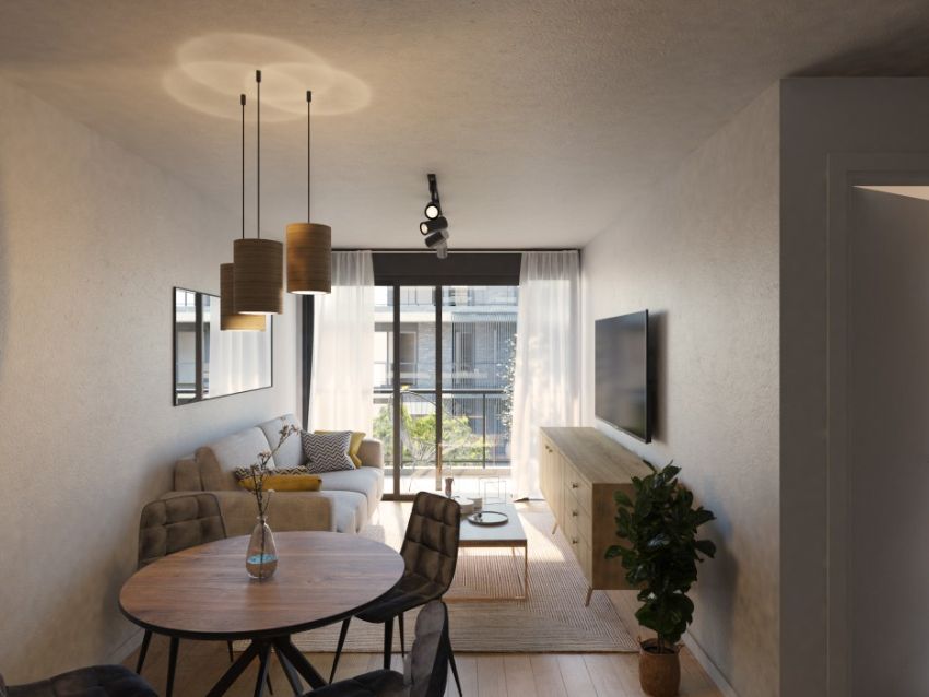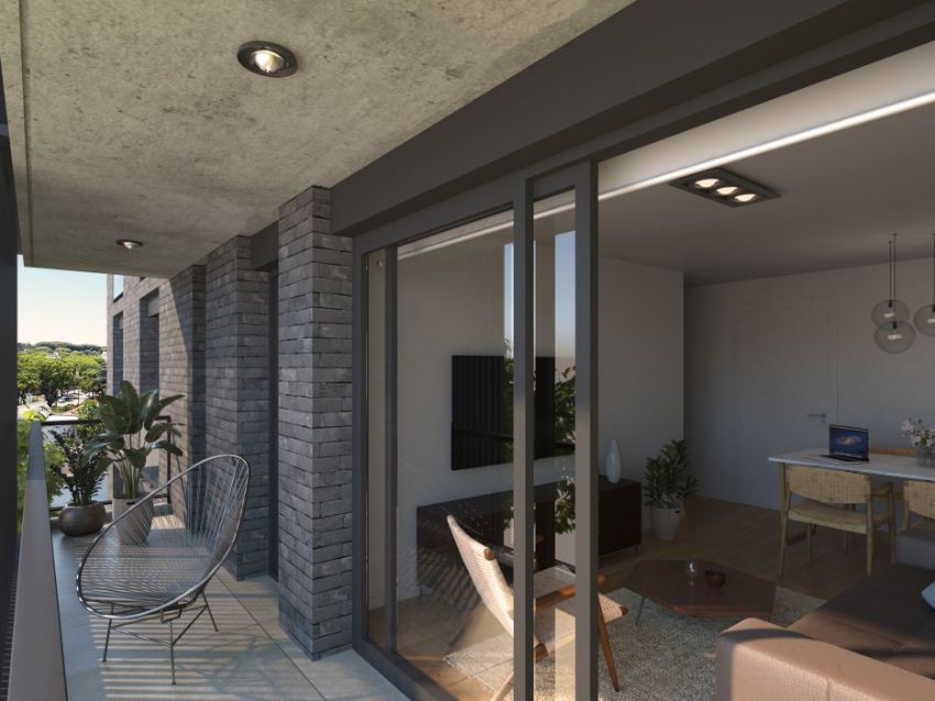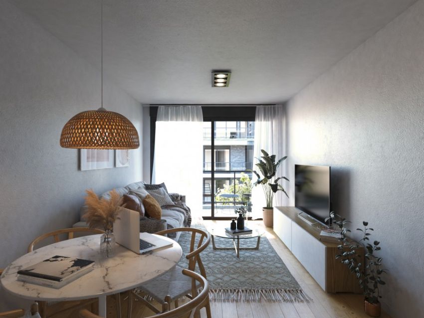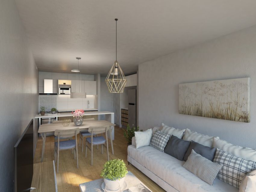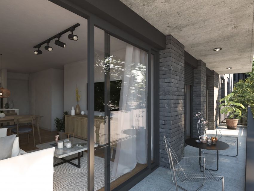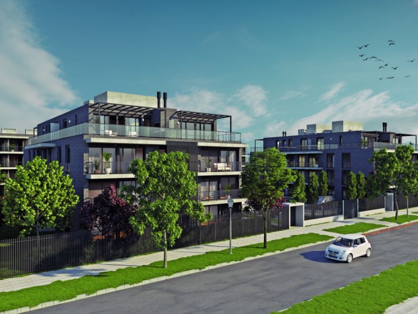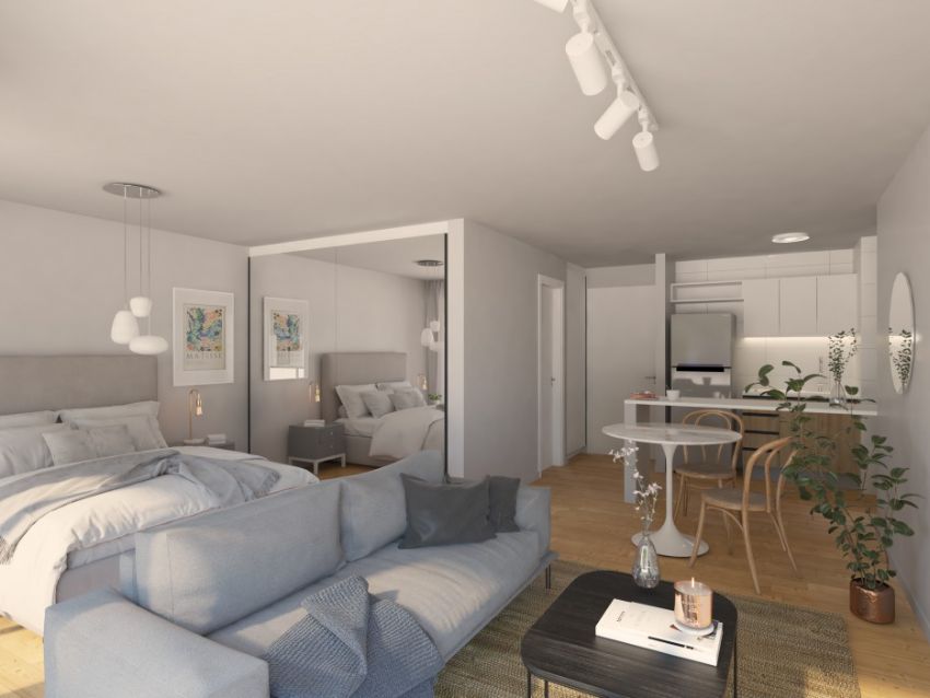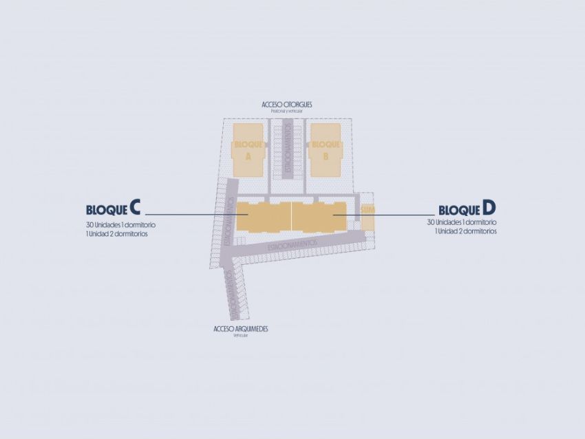 El Proyecto se desarrolla en 4 bloques con 106 apartamentos de tipo: monoambientes, 1 y 2 dormitorios distribuidos en planta baja y tres niveles, todos ellos con terraza.