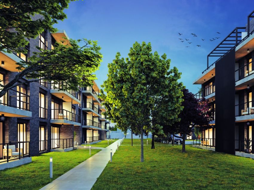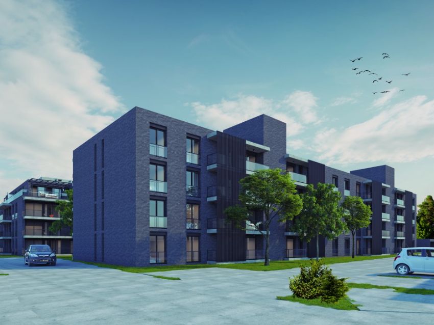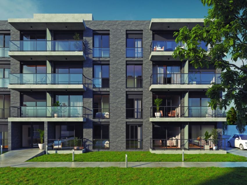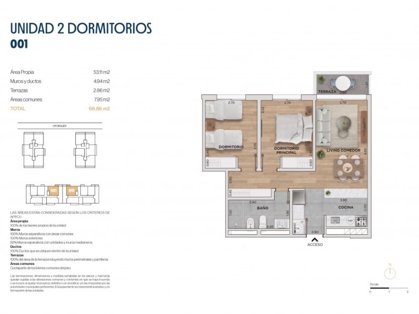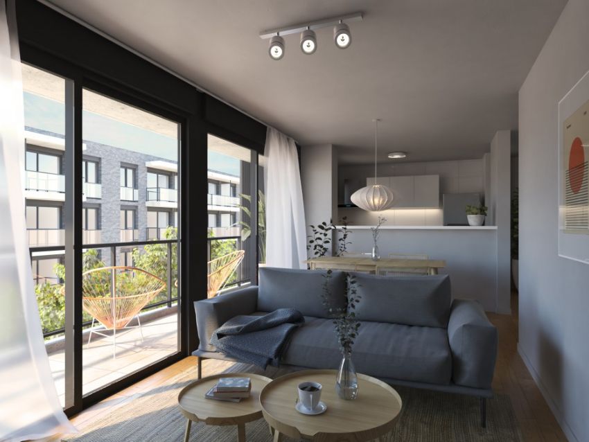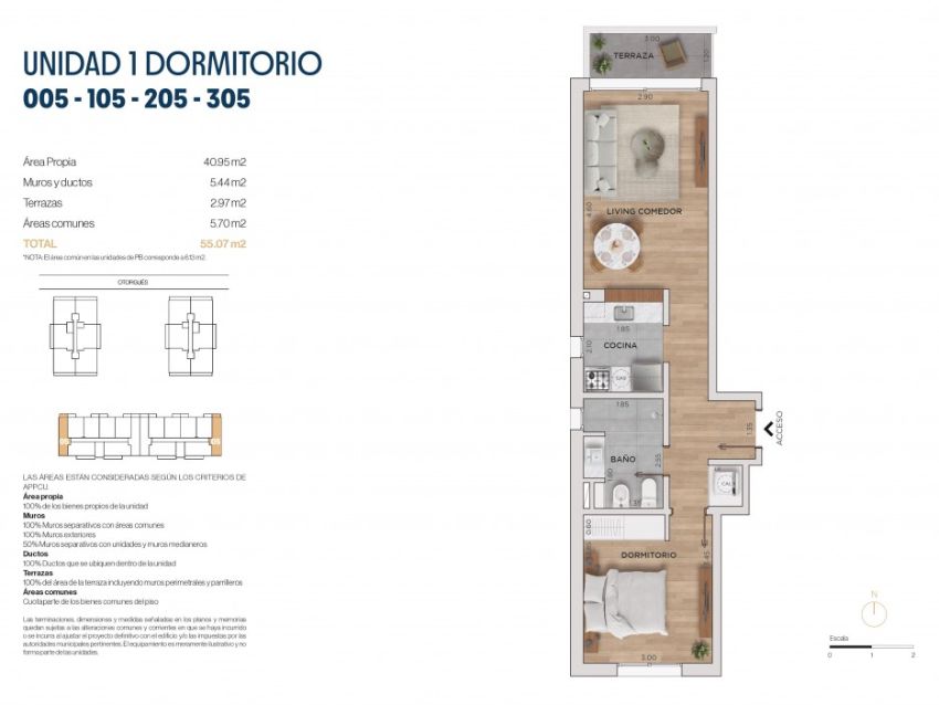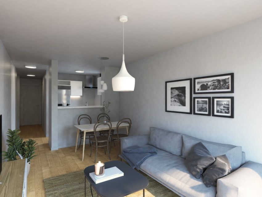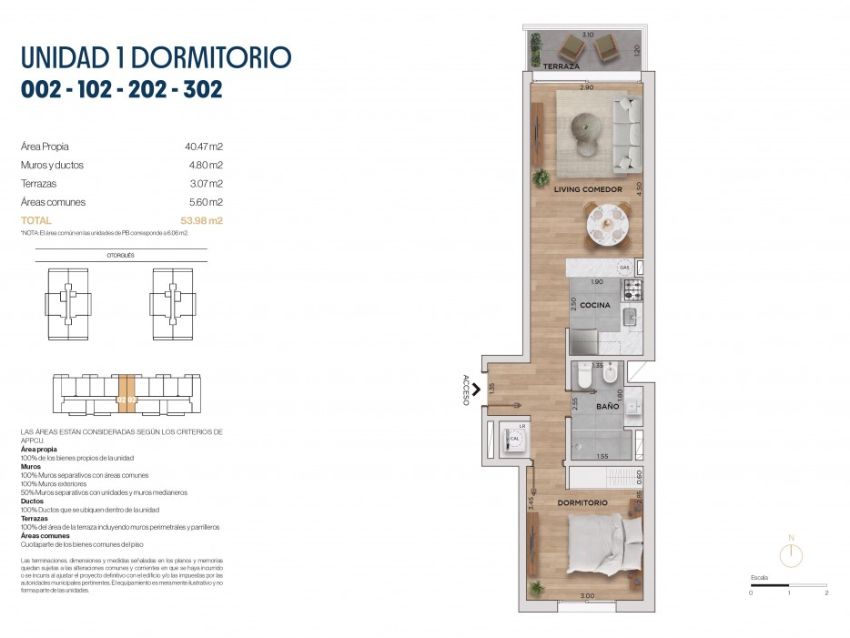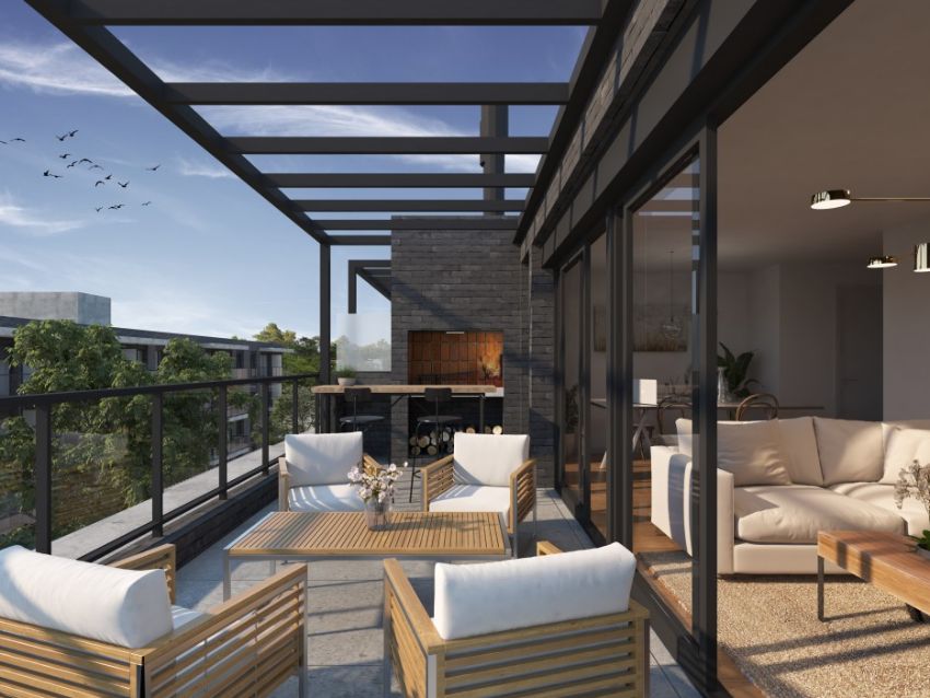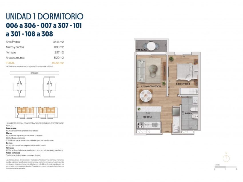 El Proyecto se desarrolla en 4 bloques con 106 apartamentos de tipo: monoambientes, 1 y 2 dormitorios distribuidos en planta baja y tres niveles, todos ellos con terraza.