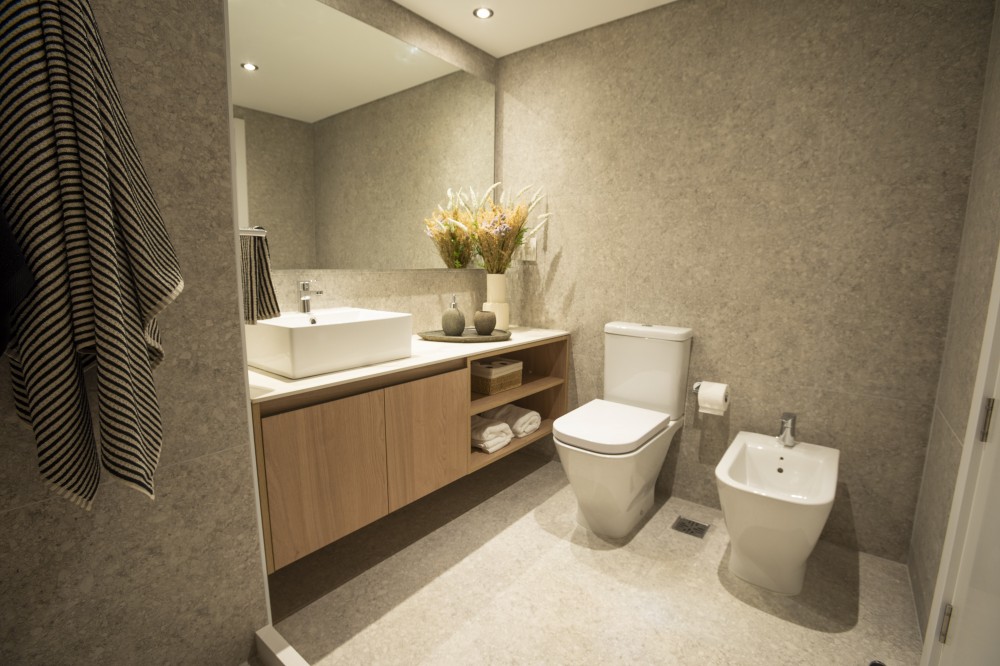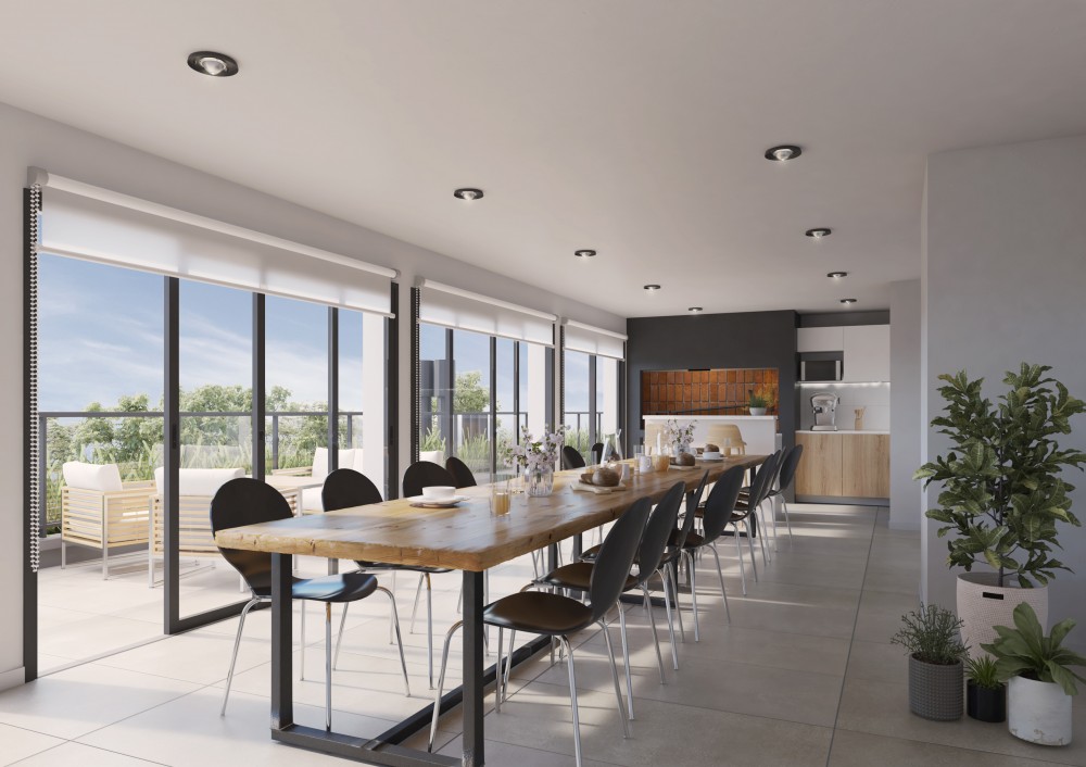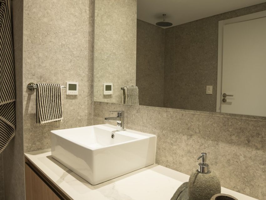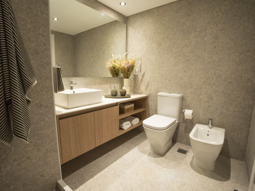 En cocinas, mesadas en cuarzo, con mueble bajo y sobre mesada, equipadas con horno, anafe y campana. Cerámicas y porcelanatos.