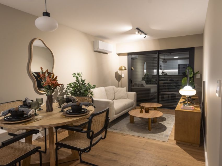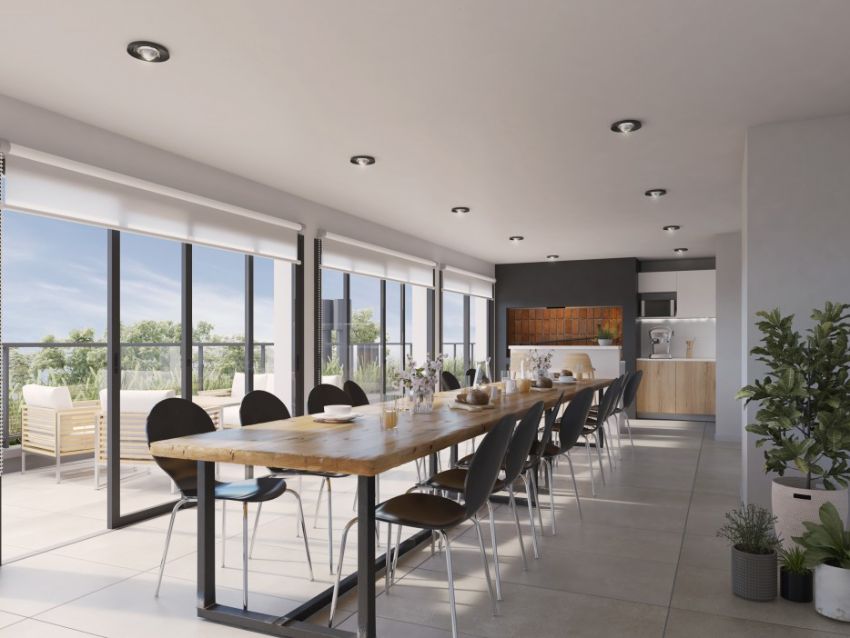 Living comedor amplio con salida a amplia terraza, cocina semi integrada. 1 dormitorio, 1 baño.