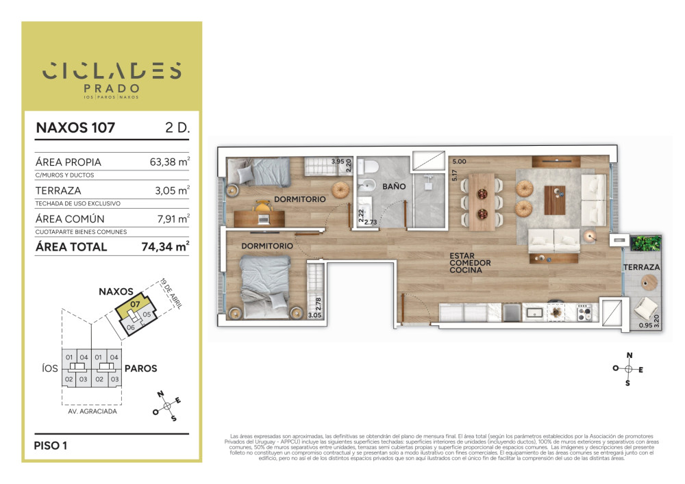 Apartamento de 2 dormitorios de 63m2 edificados más terraza de 3m2. Living-comedor con cocina integrada y baño. Ingreso por 19 de Abril. Pisos vinílicos símil madera, aberturas de aluminio y baño con piso de porcelanato. El edificio tiene rooftop con terraza pergolada, laundry y seguridad CCTV.