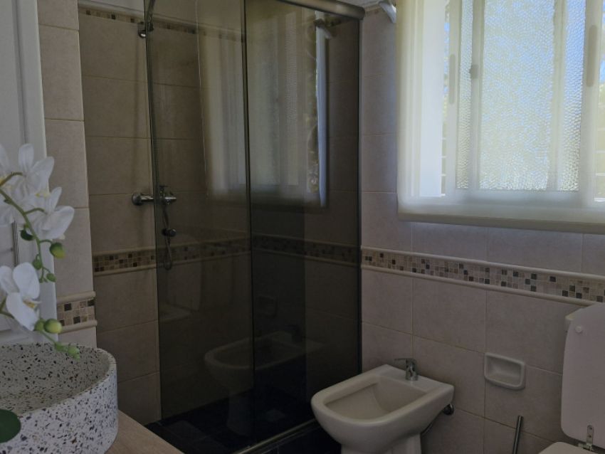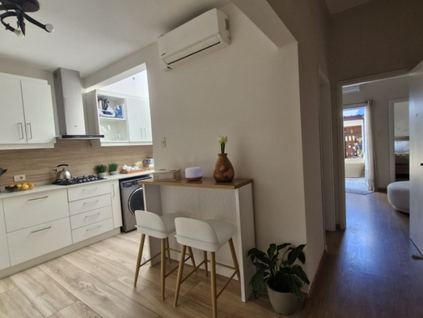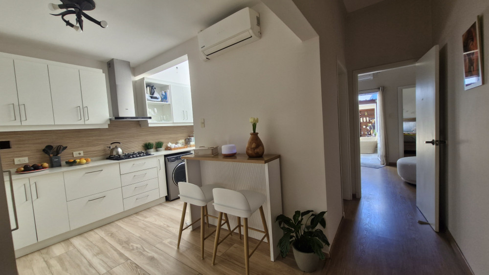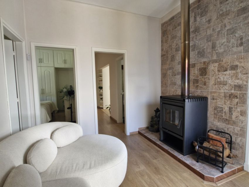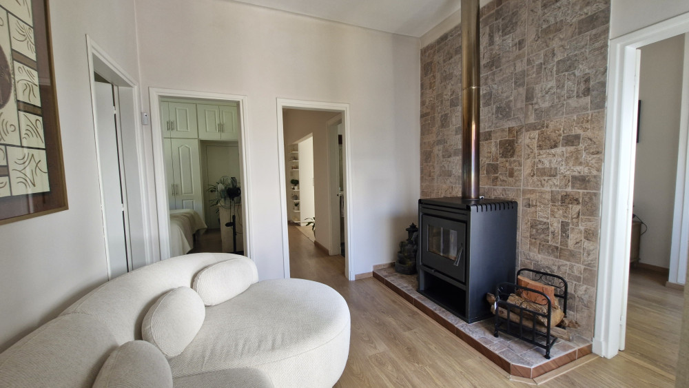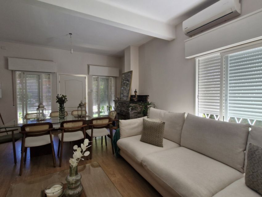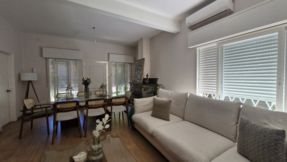 Cuenta con jardín al frente, totalmente parquizado y cercado con rejas perimetrales. Al ingresar, se accede a un living-comedor con estufa a leña, estar diario con hogar y una cocina definida, moderna y equipada con horno, anafe y campana. Dispone de tres dormitorios con placares y dos baños completos.